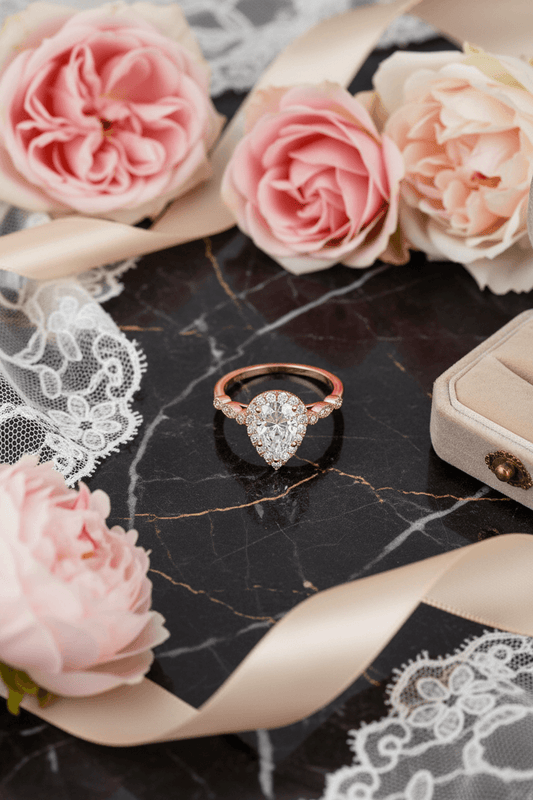 1.25CT Pear Cut Rose Gold Sterling Silver Bridal Set | Halo Engagement Ring & Wedding Band
